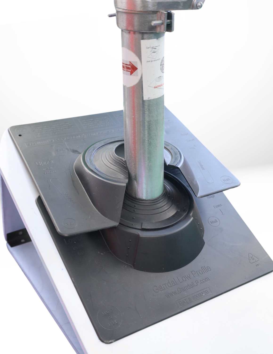 Garrdal is an American-made, 2-part pipe flashing product designed to go around rooftop obstacles such as wire masts, high-efficiency appliance stacks, and other impediments that prevent the use of standard pipe flashing. It installs in less than 60 seconds without the need for clips, perfectly seals all pipes up to 5 inches in diameter, and is UV resistant. Garrdal is proudly manufactured in the USA.